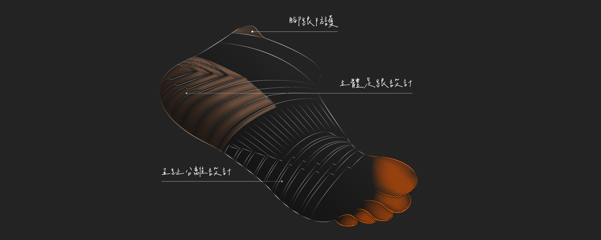 功能:足弓支撐 / 足前防護 / 足跟防護 / 腳踝穩定 / 止滑功能 / 透氣快乾